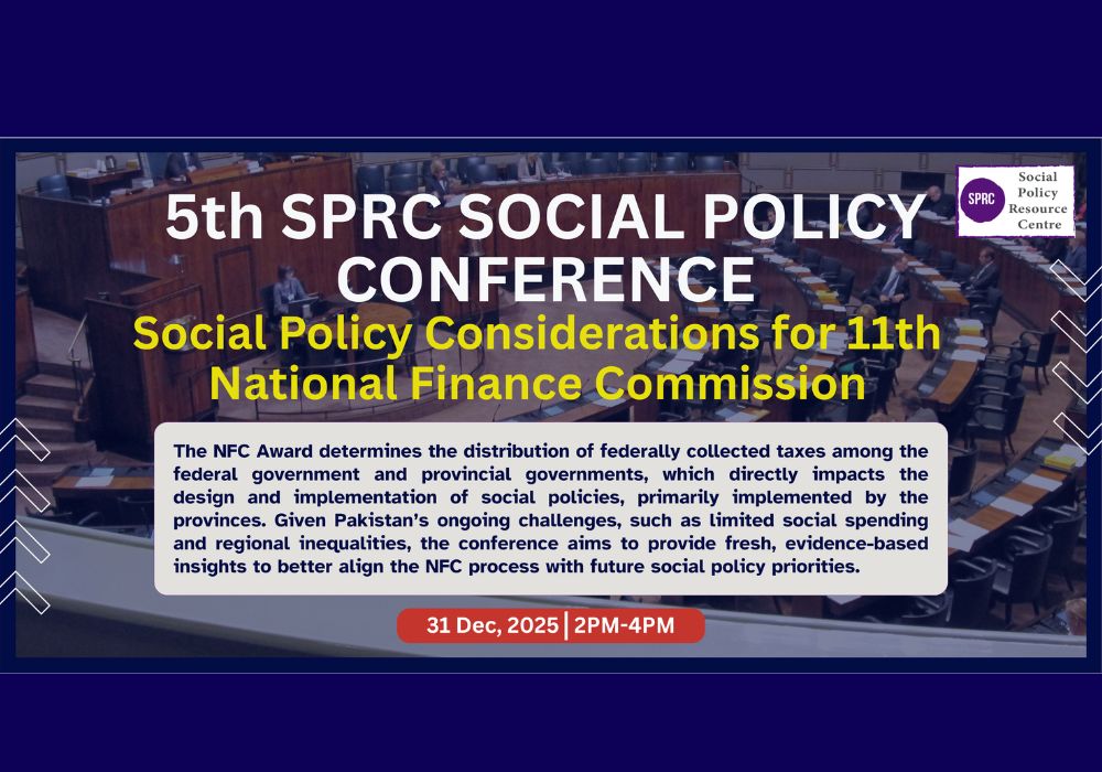 5th Social Policy Conference-Online Social Policy Considerations for 11th National Finance Commission The Fifth Social Policy Conference, organized by the Social Policy Resource Centre (SPRC), focused on social policy considerations for Pakistan’s 11th National Finance Commission (NFC) Award. The conference brought together researchers, policymakers, and practitioners to examine how fiscal federalism and NFC transfers influence […]